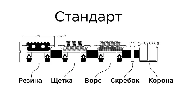 Профиль Стандарт включает в себя ворсовые вставки на алюминиевых профилях, стянутых тросом из нержавеющей стали в группу, образующую единую систему грязезащитной решётки. Помимо стандартных вставок из резины, ворса и щетки, можно использовать металлические вставки Корона и Скребок для достижения максимальной экономичности конструкции без снижения эксплуатационных характеристик.