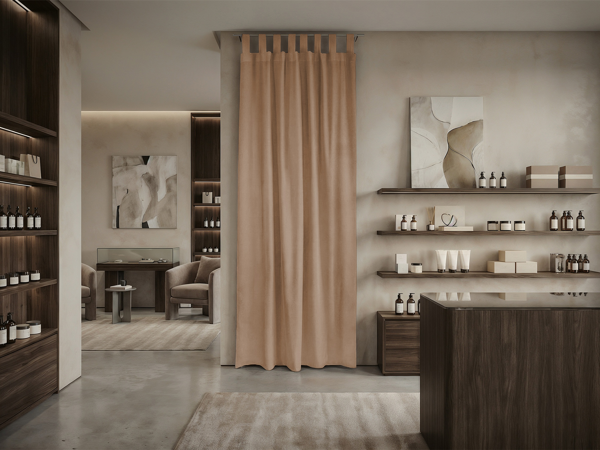 При расчете размера шторы для примерочной мы советуем руководствоваться следующими правилами. Ширина шторы: нужно к ширине проема прибавить 30-50% для того, чтобы штора в закрытом состоянии красиво драпировалась. Длина шторы: нужно померить расстояние от штанги, к которой крепится штора, до пола и вычесть 10-30 см (это высота, на которой штора будет находится от пола).