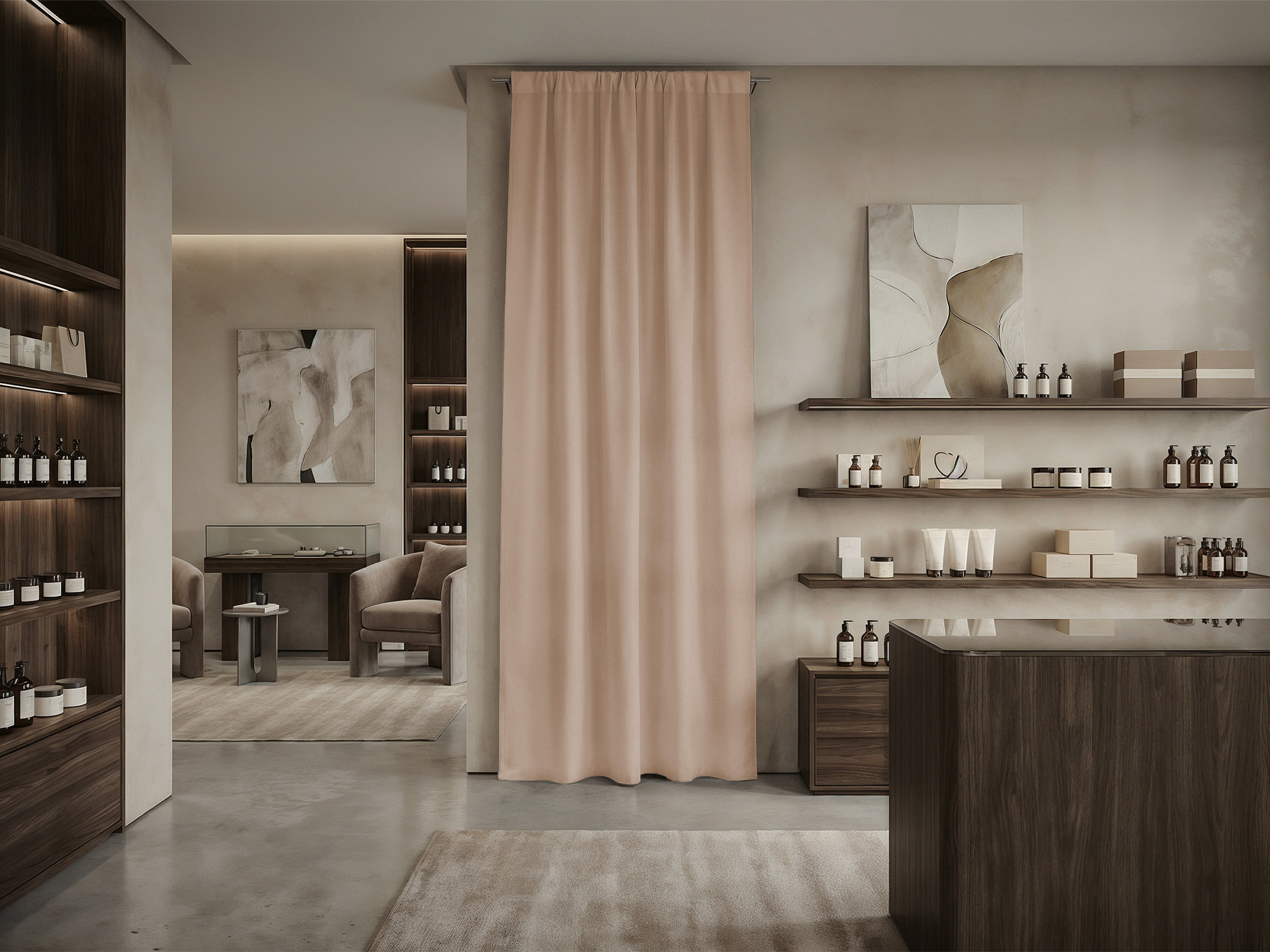 При расчете размера шторы для примерочной мы советуем руководствоваться следующими правилами. Ширина шторы: нужно к ширине проема прибавить 30-50% для того, чтобы штора в закрытом состоянии красиво драпировалась. Длина шторы: нужно померить расстояние от штанги, к которой крепится штора, до пола и вычесть 10-30 см (это высота, на которой штора будет находится от пола).