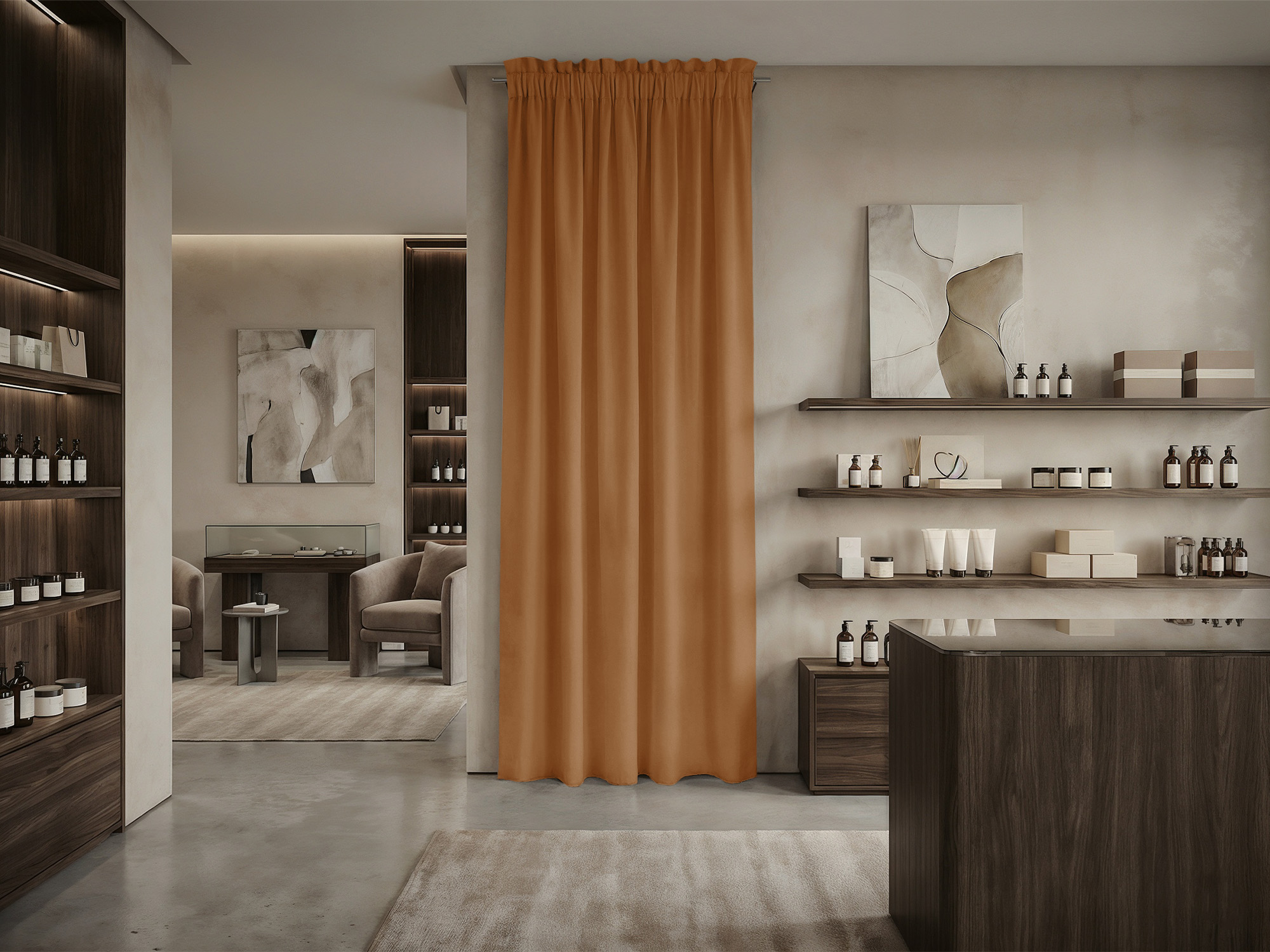 При расчете размера шторы для примерочной мы советуем руководствоваться следующими правилами. Ширина шторы: нужно к ширине проема прибавить 30-50% для того, чтобы штора в закрытом состоянии красиво драпировалась. Длина шторы: нужно померить расстояние от штанги, к которой крепится штора, до пола и вычесть 10-30 см (это высота, на которой штора будет находится от пола).