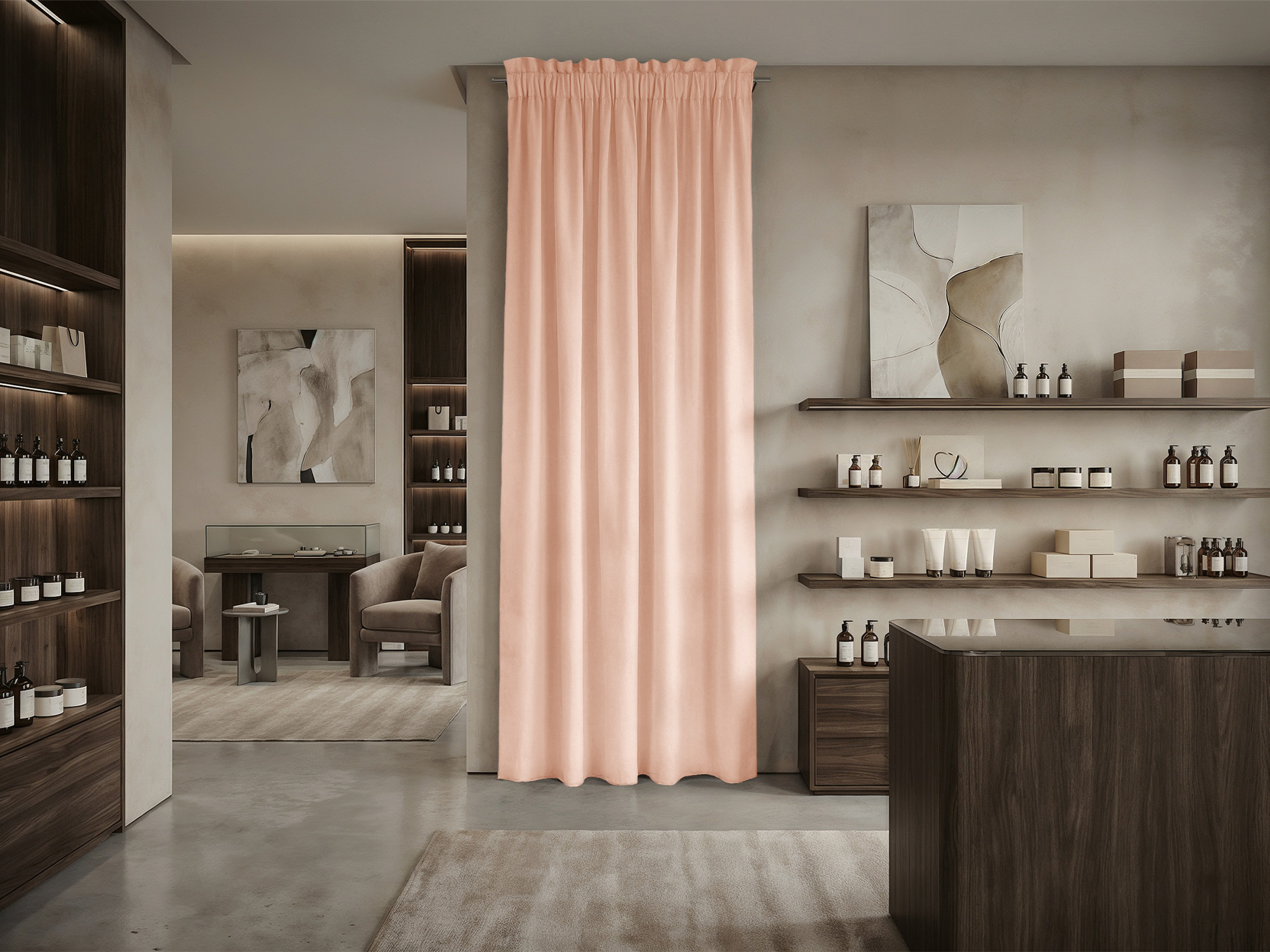 Шторы Микровелюр изготовлены из матовой ткани с деликатным рельефом, напоминающим натуральный нубук. Материал отличается приятной текстурой и оптимальной плотностью, что делает его универсальным решением для оформления как жилых помещений, так и коммерческих пространств.