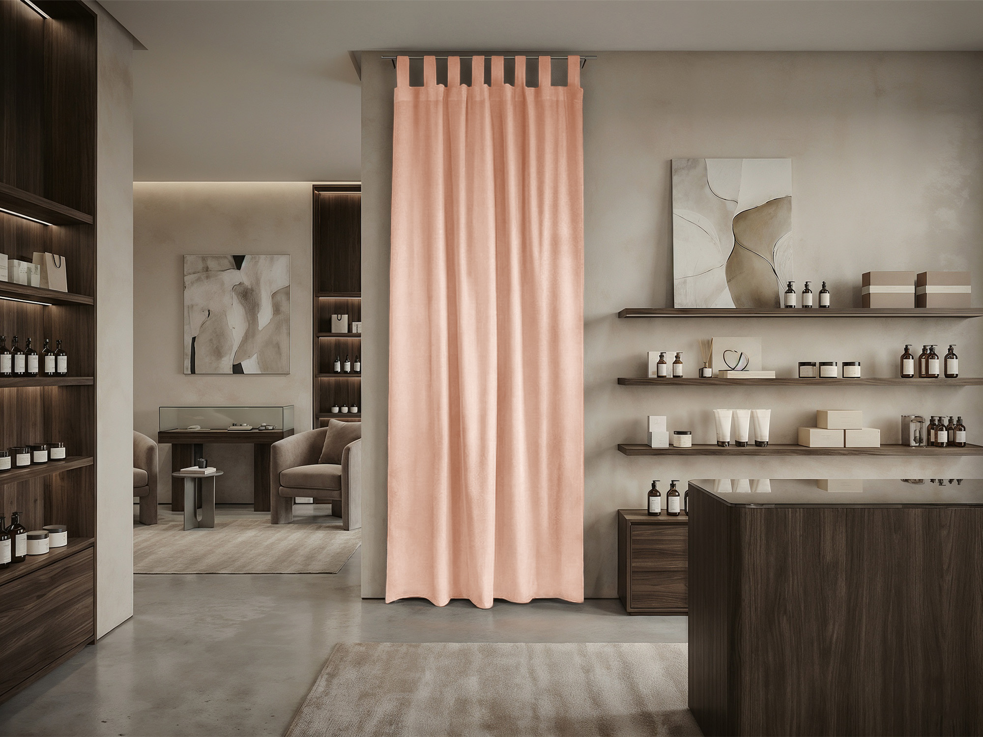 При расчете размера шторы для примерочной мы советуем руководствоваться следующими правилами. Ширина шторы: нужно к ширине проема прибавить 30-50% для того, чтобы штора в закрытом состоянии красиво драпировалась. Длина шторы: нужно померить расстояние от штанги, к которой крепится штора, до пола и вычесть 10-30 см (это высота, на которой штора будет находится от пола).