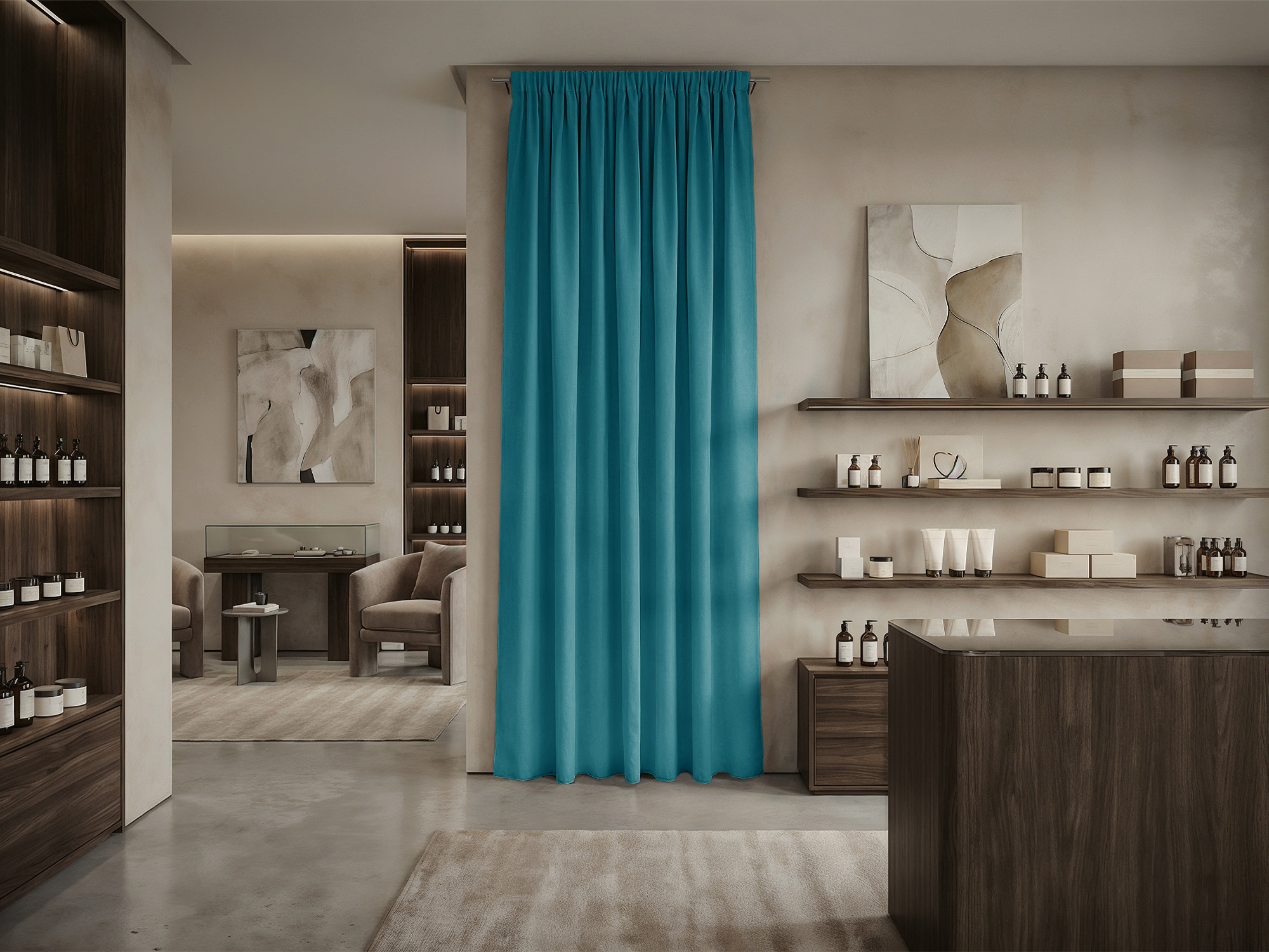 Шторы Микровелюр изготовлены из матовой ткани с деликатным рельефом, напоминающим натуральный нубук. Материал отличается приятной текстурой и оптимальной плотностью, что делает его универсальным решением для оформления как жилых помещений, так и коммерческих пространств.