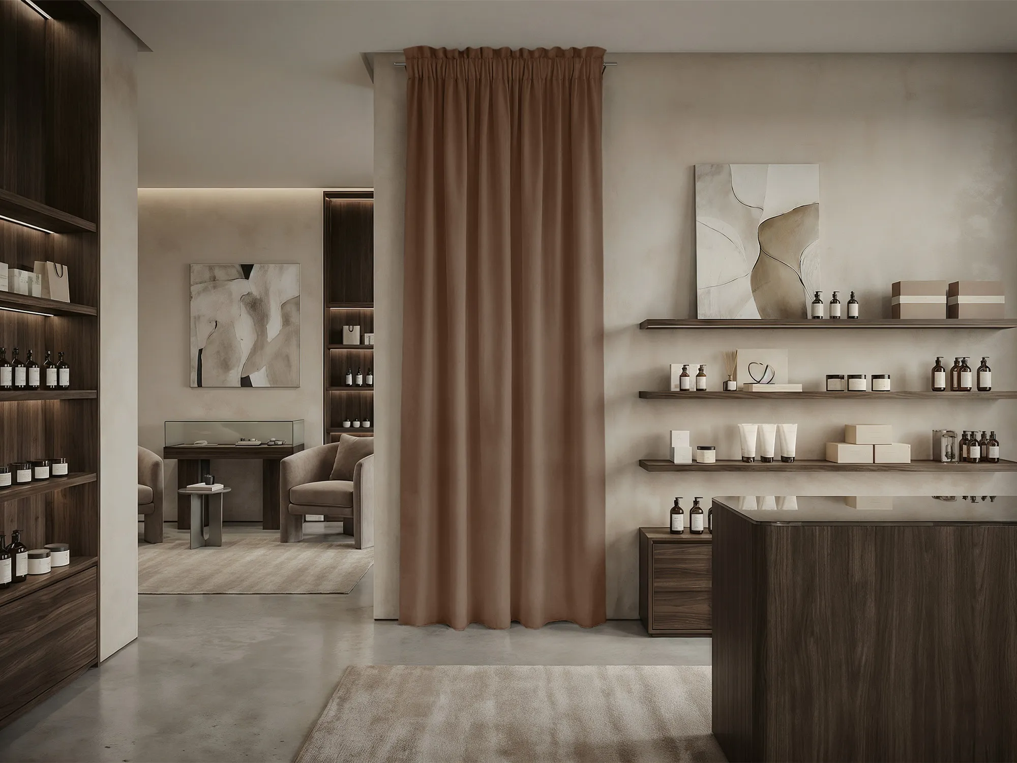 При расчете размера шторы для примерочной мы советуем руководствоваться следующими правилами. Ширина шторы: нужно к ширине проема прибавить 30-50% для того, чтобы штора в закрытом состоянии красиво драпировалась. Длина шторы: нужно померить расстояние от штанги, к которой крепится штора, до пола и вычесть 10-30 см (это высота, на которой штора будет находится от пола).