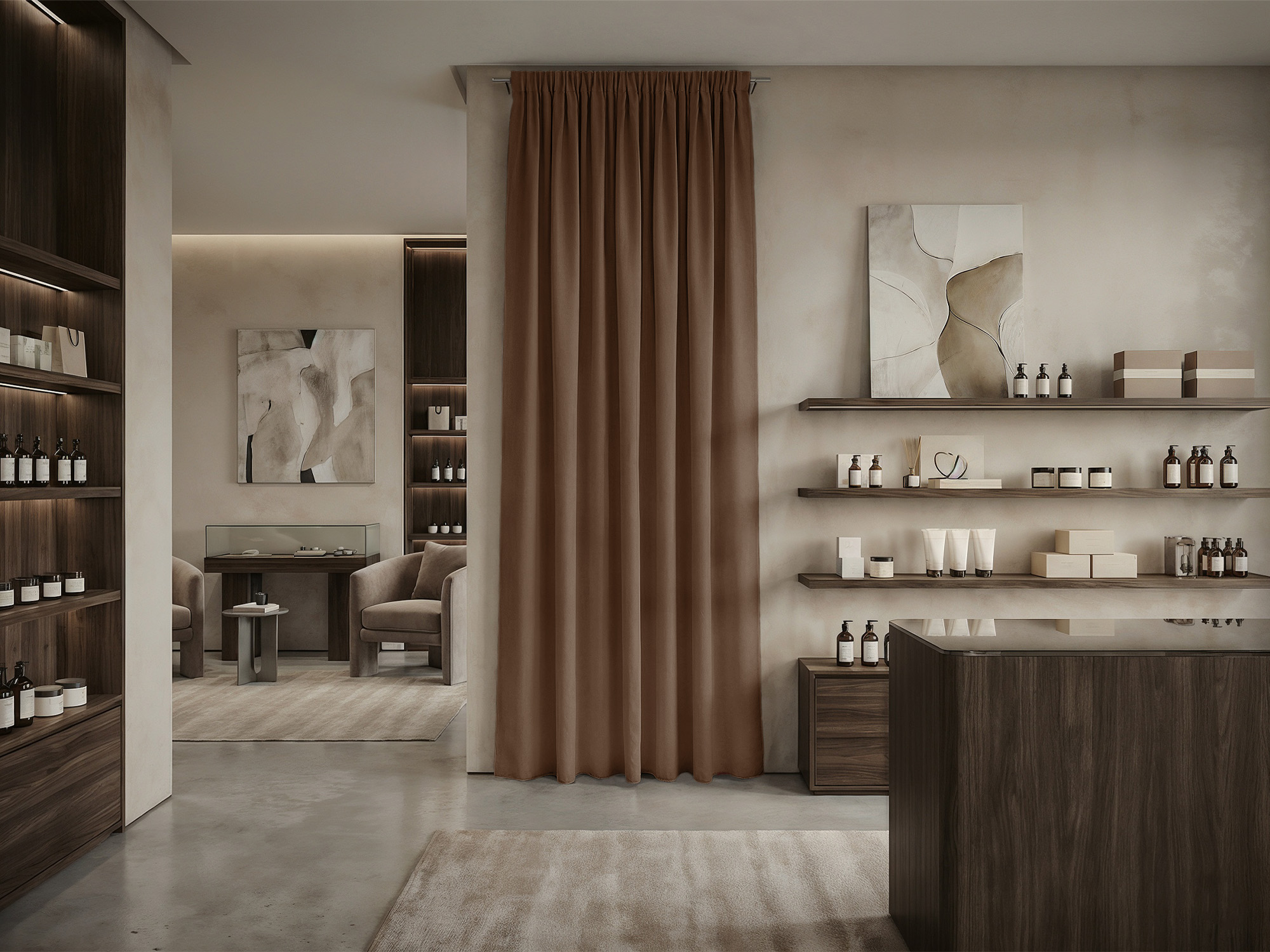 При расчете размера шторы для примерочной мы советуем руководствоваться следующими правилами. Ширина шторы: нужно к ширине проема прибавить 30-50% для того, чтобы штора в закрытом состоянии красиво драпировалась. Длина шторы: нужно померить расстояние от штанги, к которой крепится штора, до пола и вычесть 10-30 см (это высота, на которой штора будет находится от пола).