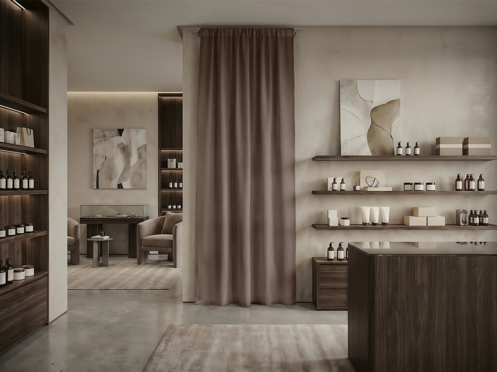 При расчете размера шторы для примерочной мы советуем руководствоваться следующими правилами. Ширина шторы: нужно к ширине проема прибавить 30-50% для того, чтобы штора в закрытом состоянии красиво драпировалась. Длина шторы: нужно померить расстояние от штанги, к которой крепится штора, до пола и вычесть 10-30 см (это высота, на которой штора будет находится от пола).