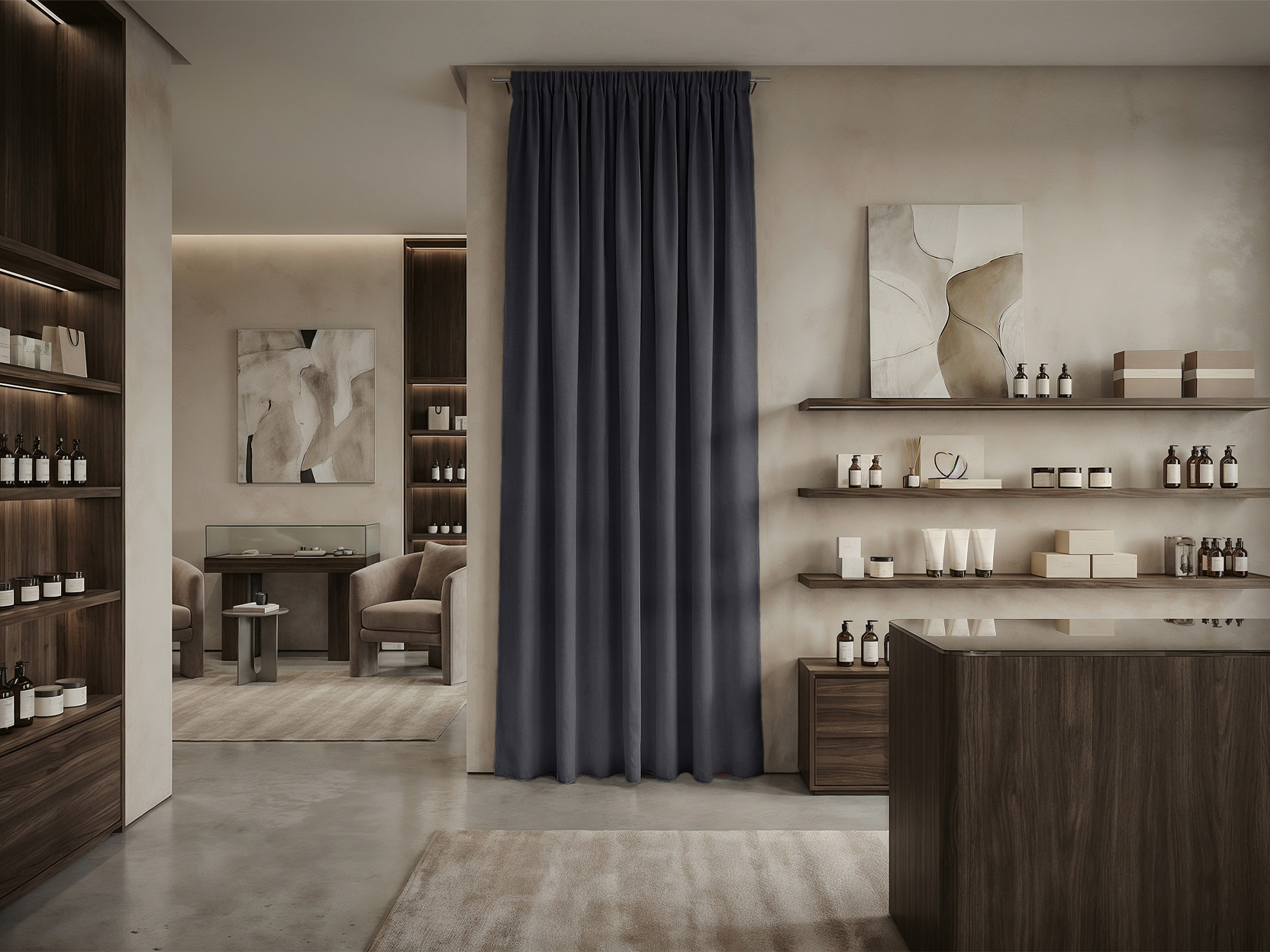 При расчете размера шторы для примерочной мы советуем руководствоваться следующими правилами. Ширина шторы: нужно к ширине проема прибавить 30-50% для того, чтобы штора в закрытом состоянии красиво драпировалась. Длина шторы: нужно померить расстояние от штанги, к которой крепится штора, до пола и вычесть 10-30 см (это высота, на которой штора будет находится от пола).