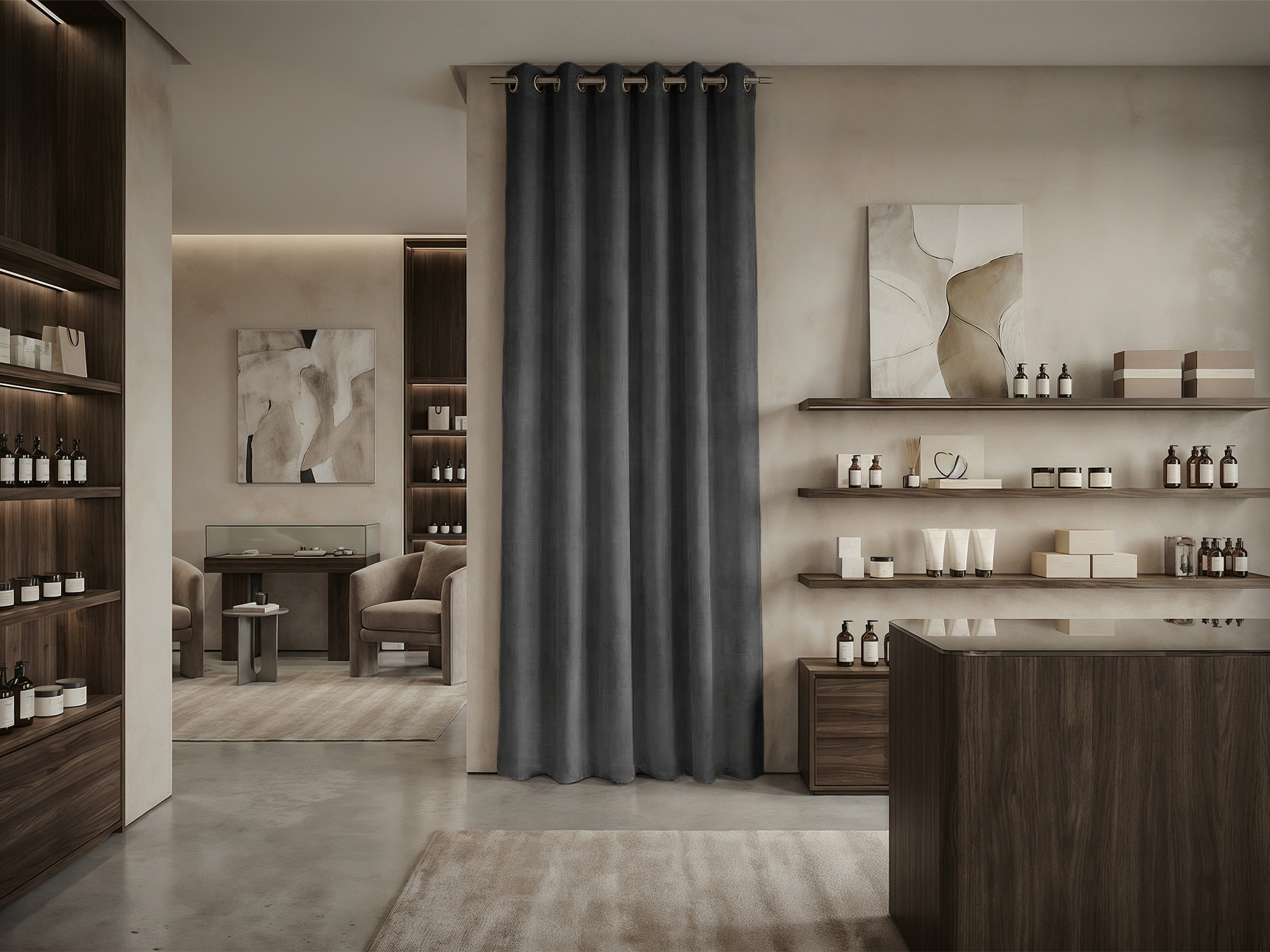 При расчете размера шторы для примерочной мы советуем руководствоваться следующими правилами. Ширина шторы: нужно к ширине проема прибавить 30-50% для того, чтобы штора в закрытом состоянии красиво драпировалась. Длина шторы: нужно померить расстояние от штанги, к которой крепится штора, до пола и вычесть 10-30 см (это высота, на которой штора будет находится от пола).