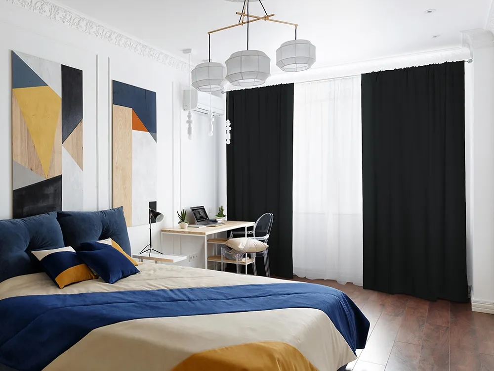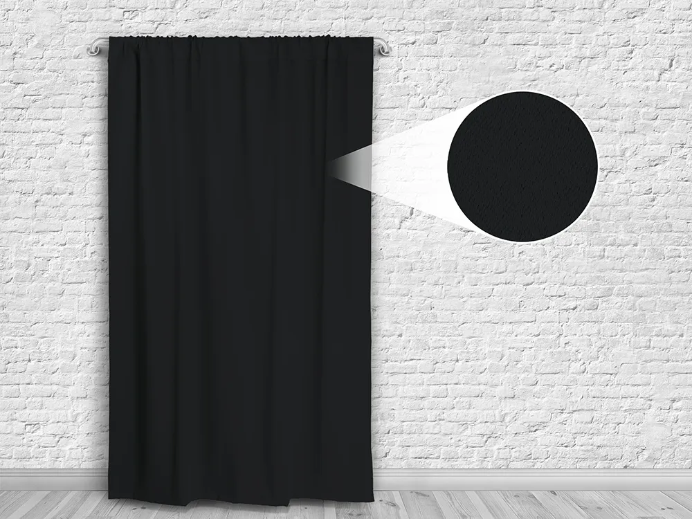 Шторы качества Премиум производятся из материала блэкаут (blackout) - это полиэфирная ткань, состоящая из трех слоев. Внутренний слой выполнен из черных волокон, что обеспечивает полную светонепроницаемость.